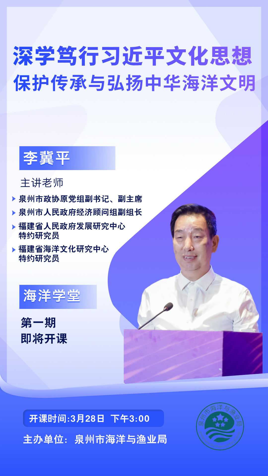 “海洋学堂”将聚焦海洋科学、生态保护、资源开发、政策法规等多元领域,邀请专家学者、行业先锋传道授业,通过深入浅出的讲解、生动鲜活的案例,带领大家走近海洋、读懂海洋、守护海洋。我们期待,这一系列讲座能成为启迪思维的窗口、凝聚共识的纽带,为泉州海洋事业发展注入更多智慧与活力。